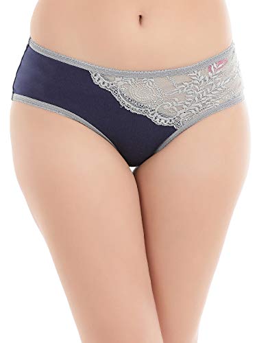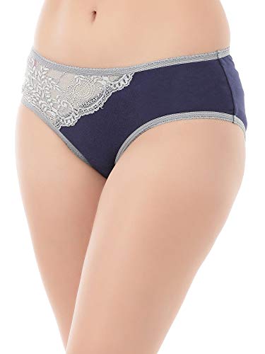 Teal green mid waist hipster with medium coverage. Crafted with cotton spandex for all-day comfort. Grey lace panel on one side for a stylish look. Soft trimmed elastic at the waistband and leg openings for a snug fit. Double layered gusset for hygiene.