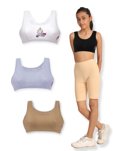 D’chica Sports Bra for Girls (Pack of 4) Cotton Non Padded Full Coverage Beginners Bra, Non-Wired T-Shirt Gym Workout Training Regular Strap Bra for Teenager