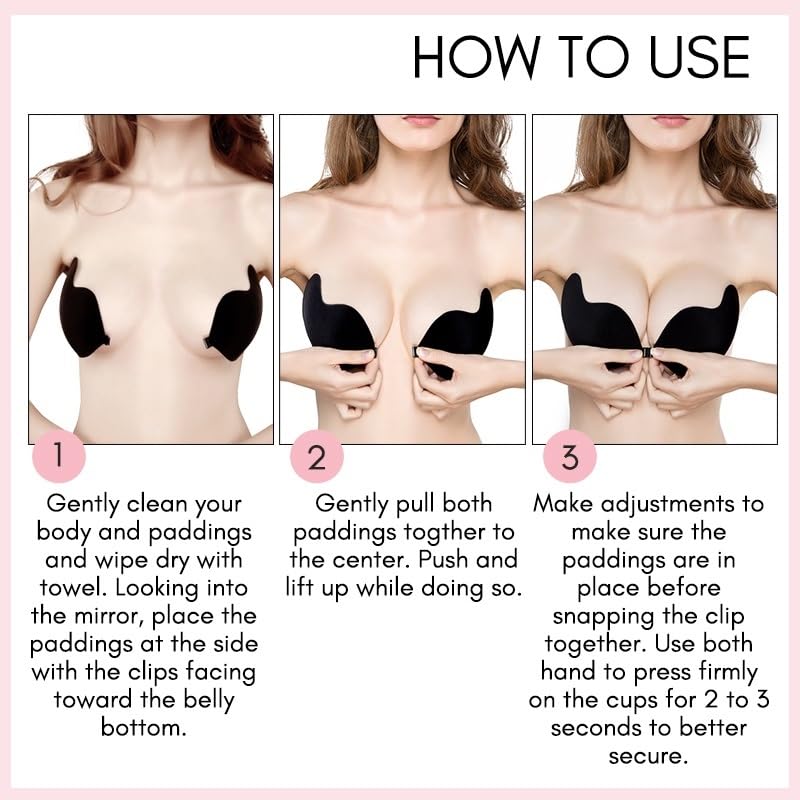 Hold the bra cups in position over your breasts, adjusting them to achieve the desired lift and cleavage effect.