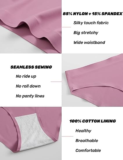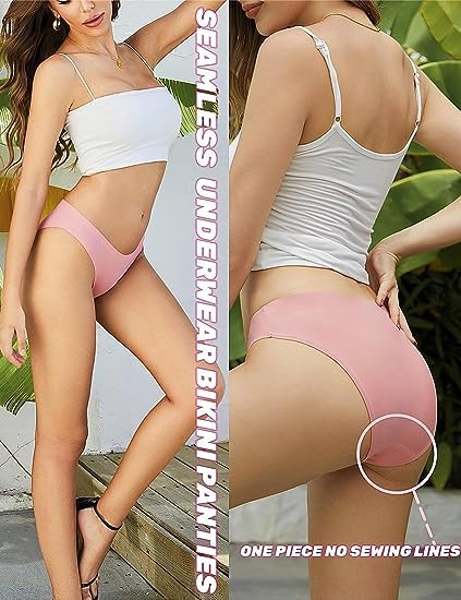 Seamless Underwear for Women:Made of 85% nylon and 15% of spandex fabric, soft stretchy and no panty lines, smooth and invisible under clothing, comfortable wearing with leg opening.No show panties: Stretchy wide waistband to keep in good stretch without loose or tight, can stay in place whole day no roll down. Completely no VISIBLE PANTY LINES and seamless style.Seamless Bikini Underwear: Sexy low rise bikini style to be an elegant lady.