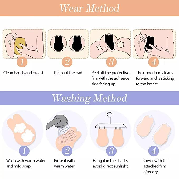 The women invisible cups is crafted with a natural, soft and breathable for a proper lift and separation Invisible Bras has biological glue inside the cup, so freeing not having any straps and easily be adhered directly to the skin, but still maintaining cleavage and optimum comfort. Just enjoy your time because there is no irritation or itching. Not only does the bra for strapless dress actually stick, they somehow do not leave any kind of sticky residue after several uses. Do not worry about slipping or peeling. With adhesive push-up cups that are designed to vanish under all your tops while creating a sexy lift. This cup shape, large cup push up bra could hold your girls up and pushed them together. The most important thing is that there is blank area, where the nipples should be, so your extra sensitive skin there is not affected by the sticky.